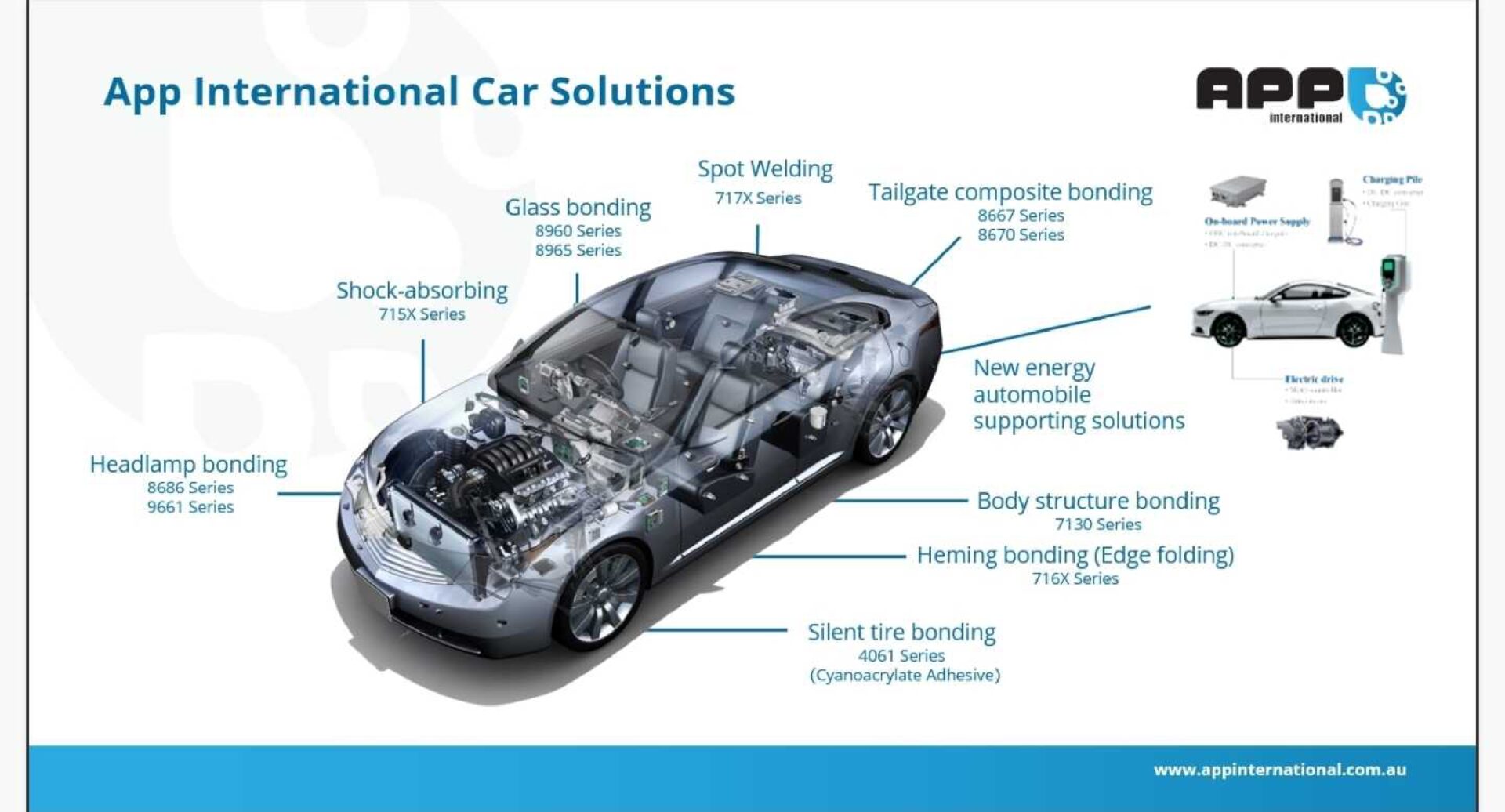 With a proven legacy of excellence and adhesive solutions integral to the OEM production of vehicles by some of the most respected names in the automotive industry, App International Pty Ltd is the partner of choice for car manufacturers seeking innovative, reliable, and high-performance products. Our Australian expertise, combined with a global perspective, enables us to deliver solutions that meet international standards while addressing local market needs. We are driven by a passion for quality, a commitment to sustainability, and a dedication to fostering enduring partnerships with our clients.